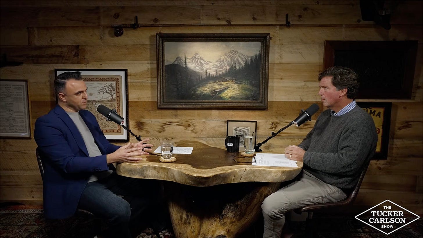 Tucker Carlson, right, interviews the Rev. Fares Abraham on “The Tucker Carlson Show.” (Video screen grab)
