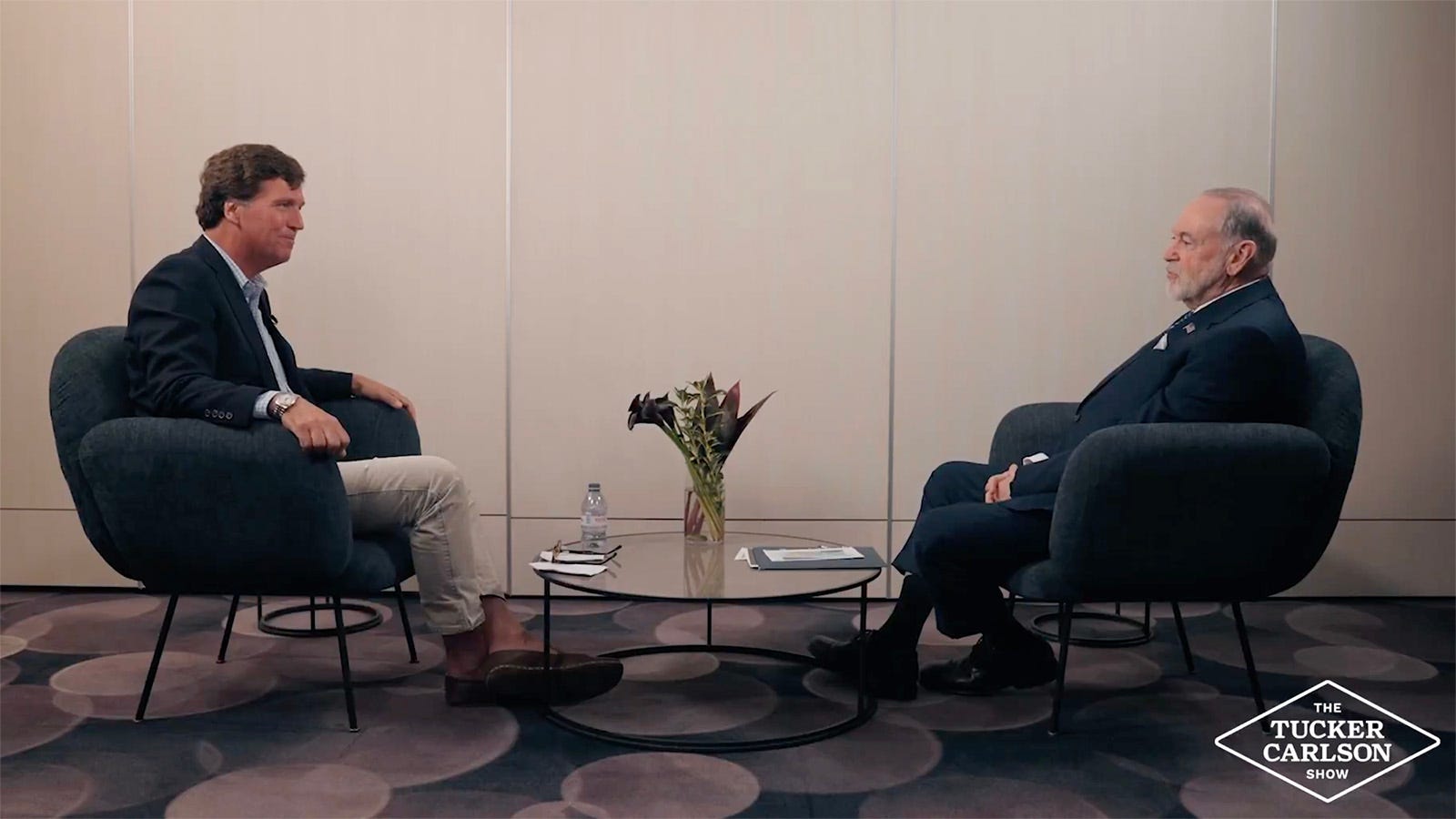 Tucker Carlson, left, interviews Mike Huckabee, the U.S. ambassador to Israel, on a recent episode of “The Tucker Carlson Show.” (Video screen grab)